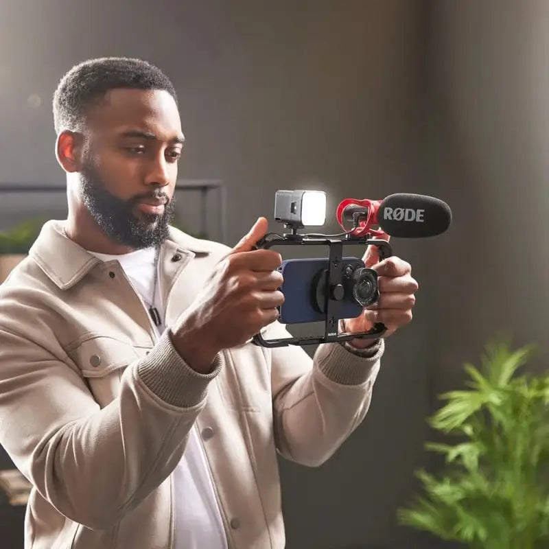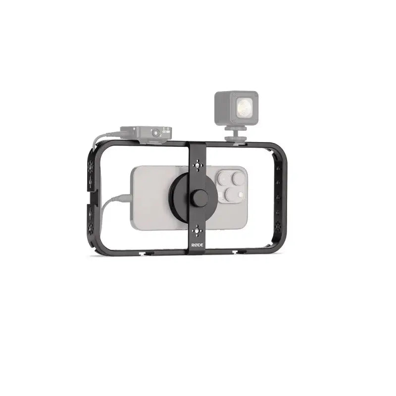 Rode Phone Cage es un sistema de montaje ultraseguro para fijar un iPhone® MagSafe® u otro smartphone y convertirlo en un equipo de rodaje profesional